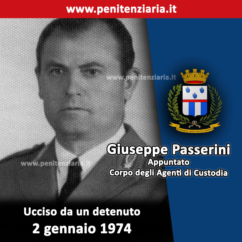 In servizio alI’Istituto di trattamento per giovani adulti di Civitavecchia, il 2 gennaio 1974 l’Appuntato Giuseppe Passerini viene colpito a morte da un detenuto ergastolano armato di una pistola a canna lunga, con la quale aveva costretto un sottufficiale dell’ufficio servizi a farsi accompagnare alla porta carraia con l’intento di evadere. Giunti sul posto, Passerini, che aveva intuito il pericolo, spinse il sottufficiale all’interno della porta carraia e tentò di bloccare le uscite. L’ergastolano esplose un colpo a bruciapelo verso l’Appuntato che cadde esanime, quindi afferrò le chiavi e, prima di scappare, esplose altri due colpi verso Passerini ormai privo di vita.